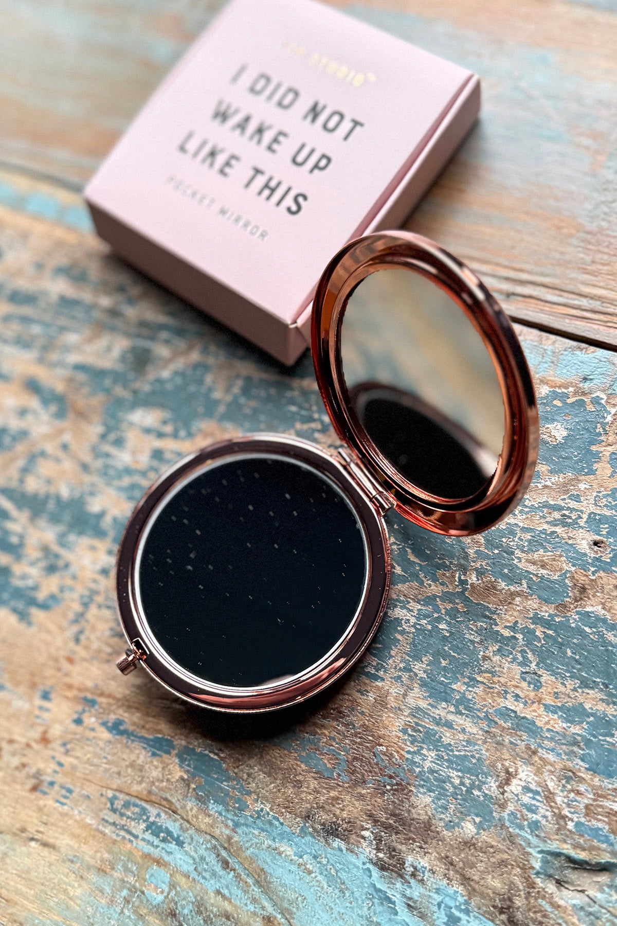 Et charmerende lommespejl med to spejle, hvoraf det ene forstørrer. Åbnes nemt med en knap. Spejlet er dekoreret med rosaguldfarvede detaljer og leveres i en elegant gaveæske på 85×85×22 mm.