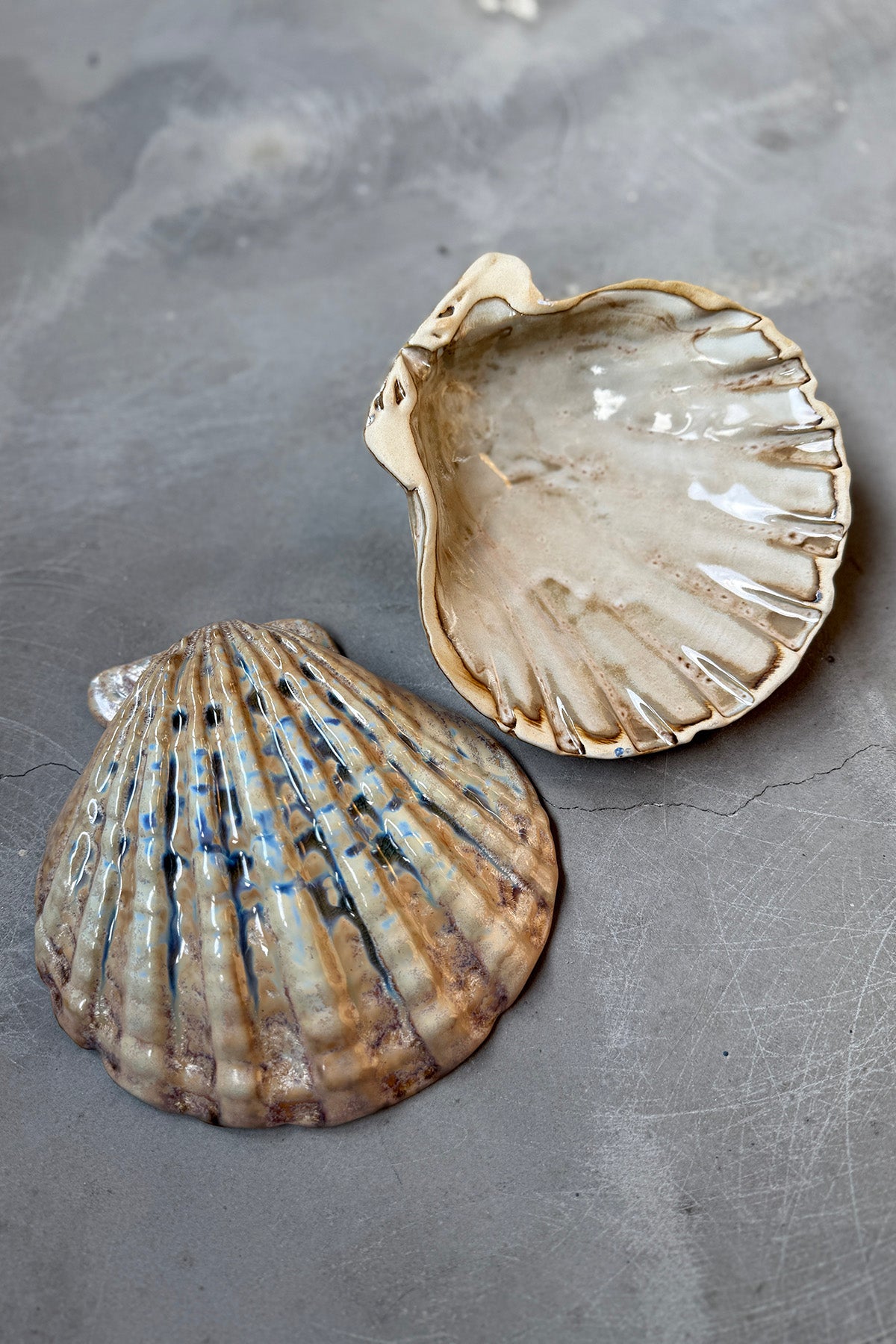 Dette sæt med to skåle/tallerkener med kammusling lavet i keramik.