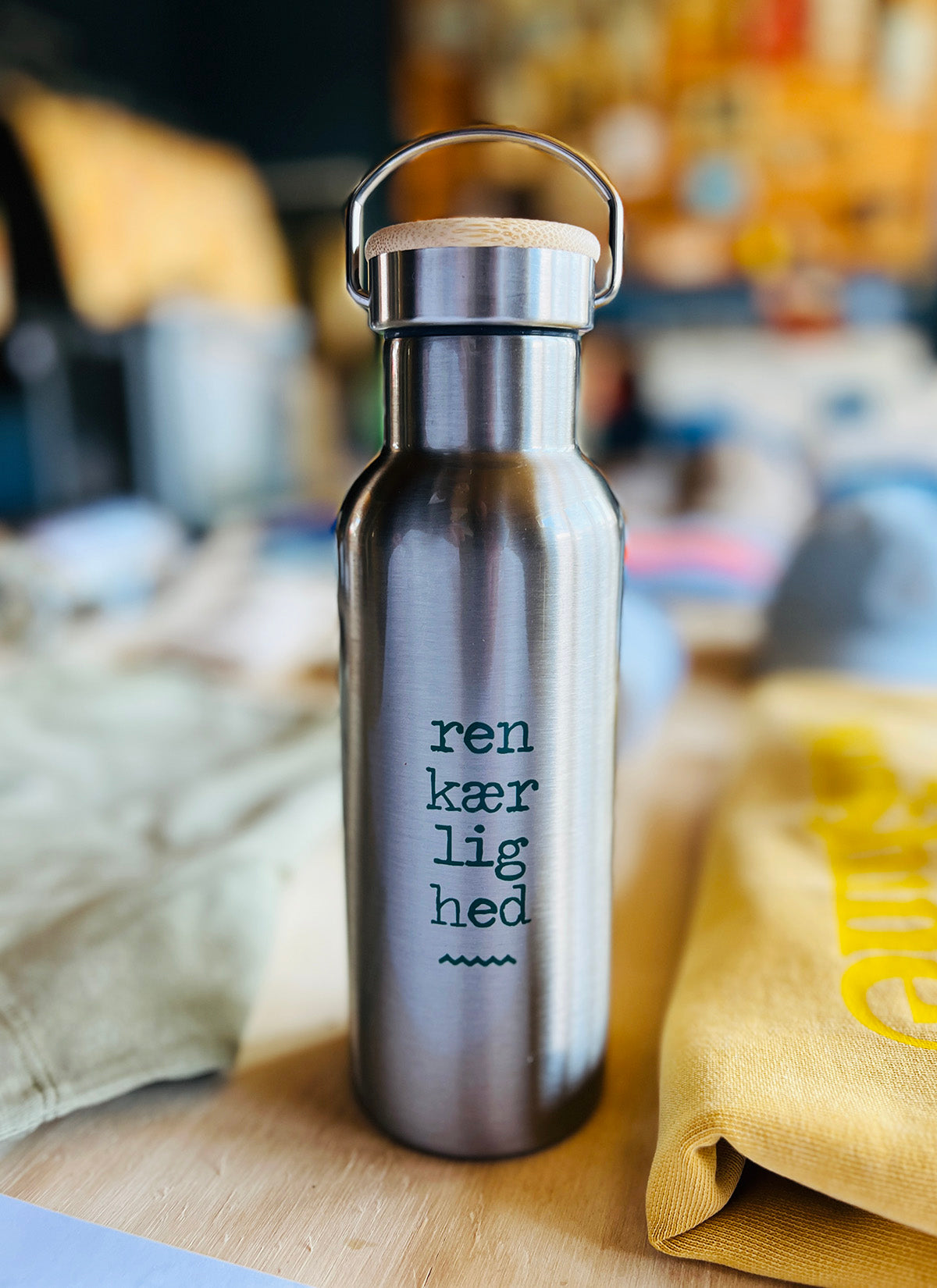 Thermo-drikkedunk i rustfri stål med bambuslåg og metalhank.