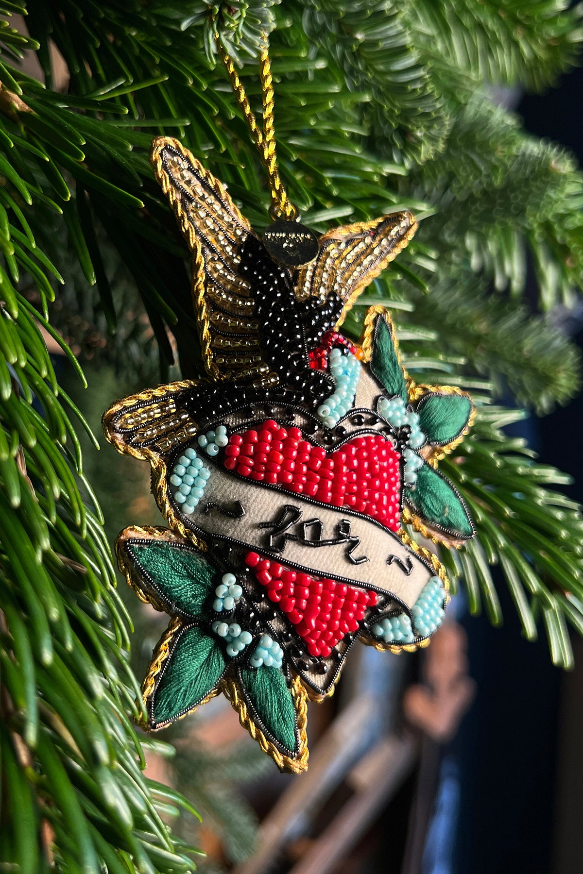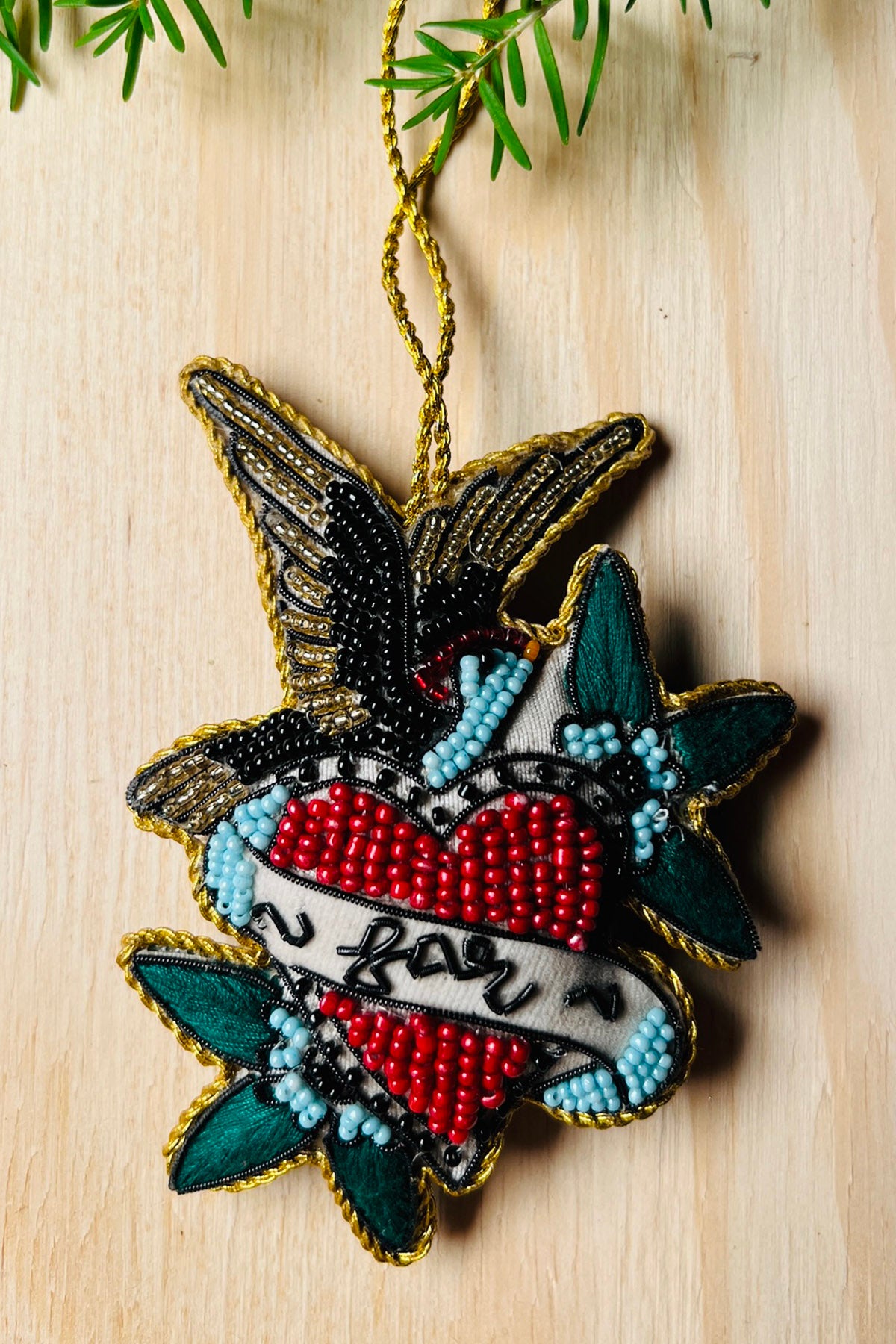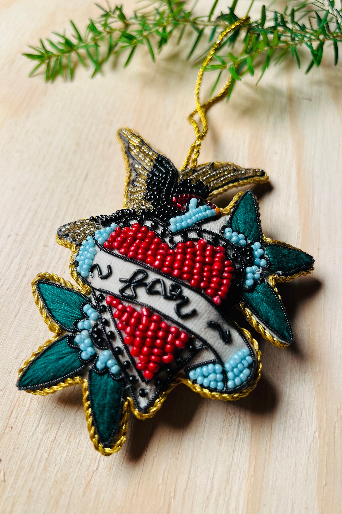 Lavet af håndfarvede glasperler med metallic-snor. Den er broderet ens på begge sider.