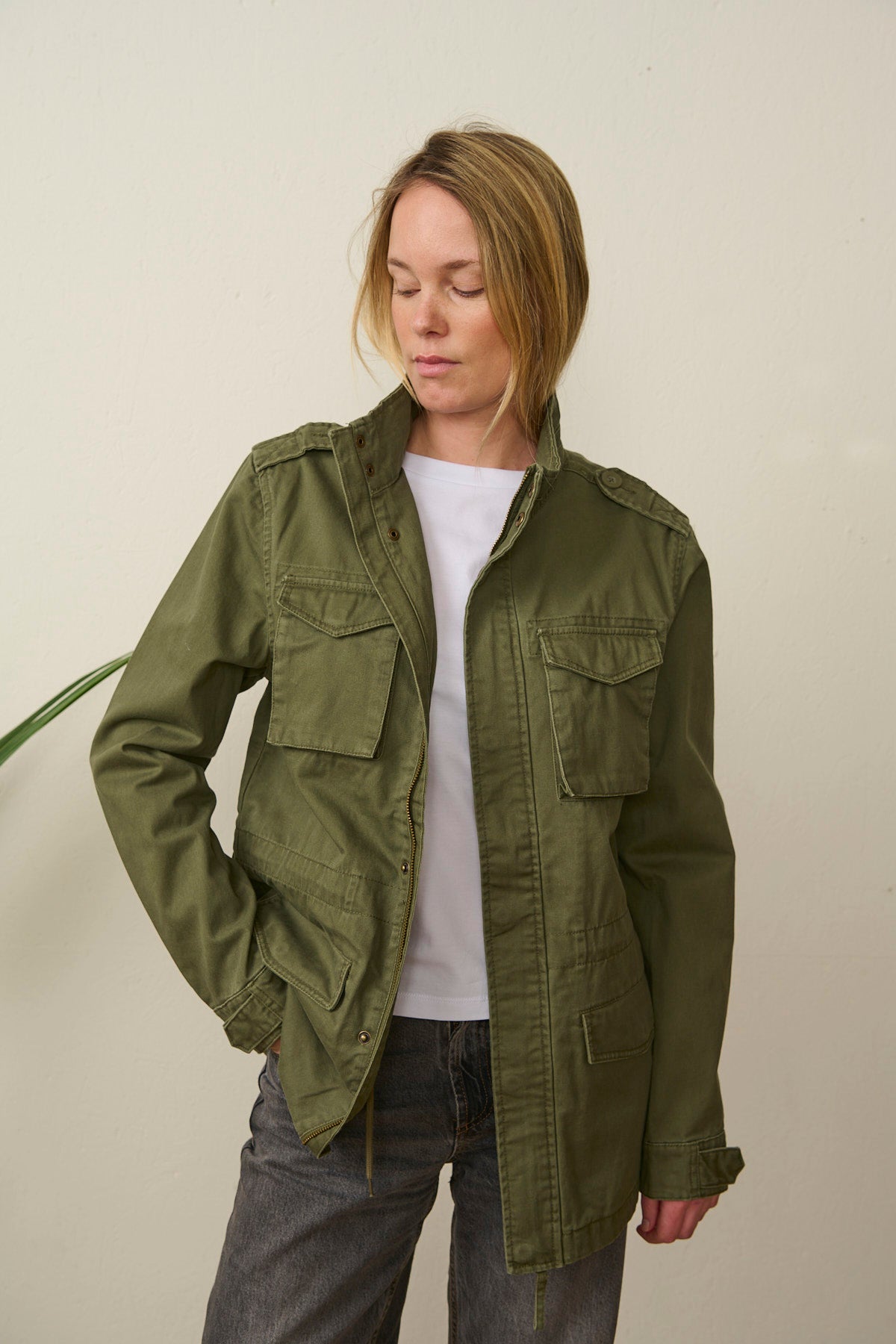 Med en justerbar snøre i taljen kan du tilpasse jakken, så den sidder perfekt, uanset om du er på farten eller slapper af. De fire praktiske yderlommer med trykknapper giver masser af opbevaringsmuligheder, mens skulderfane med knap tilføjer et klassisk touch.