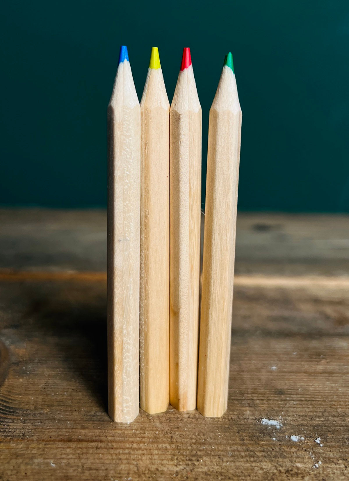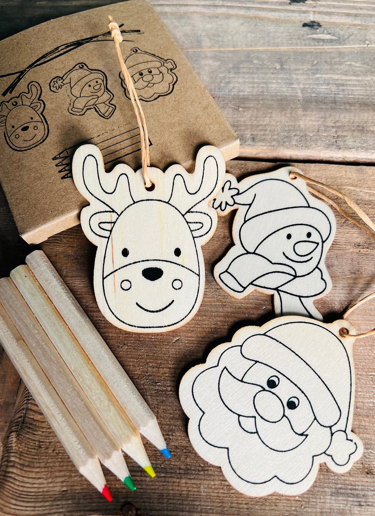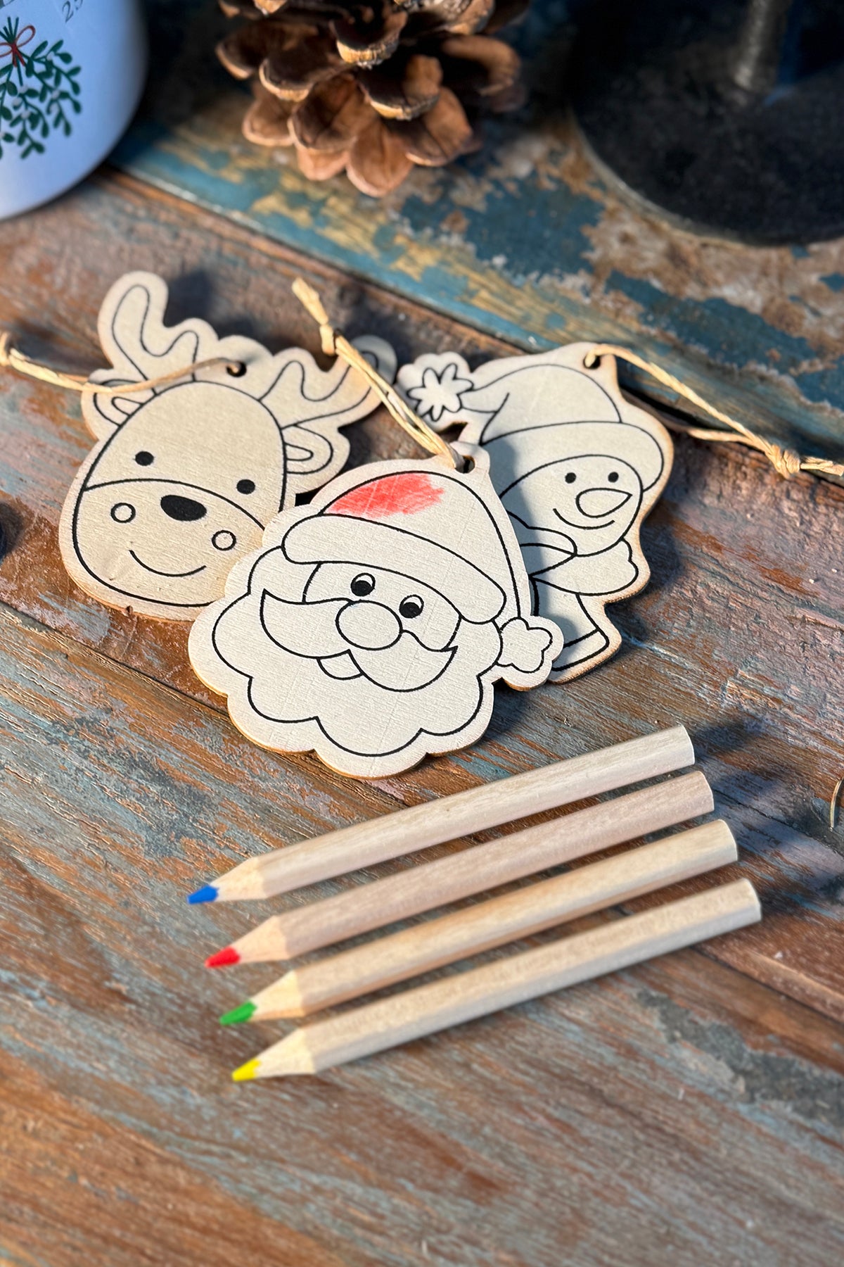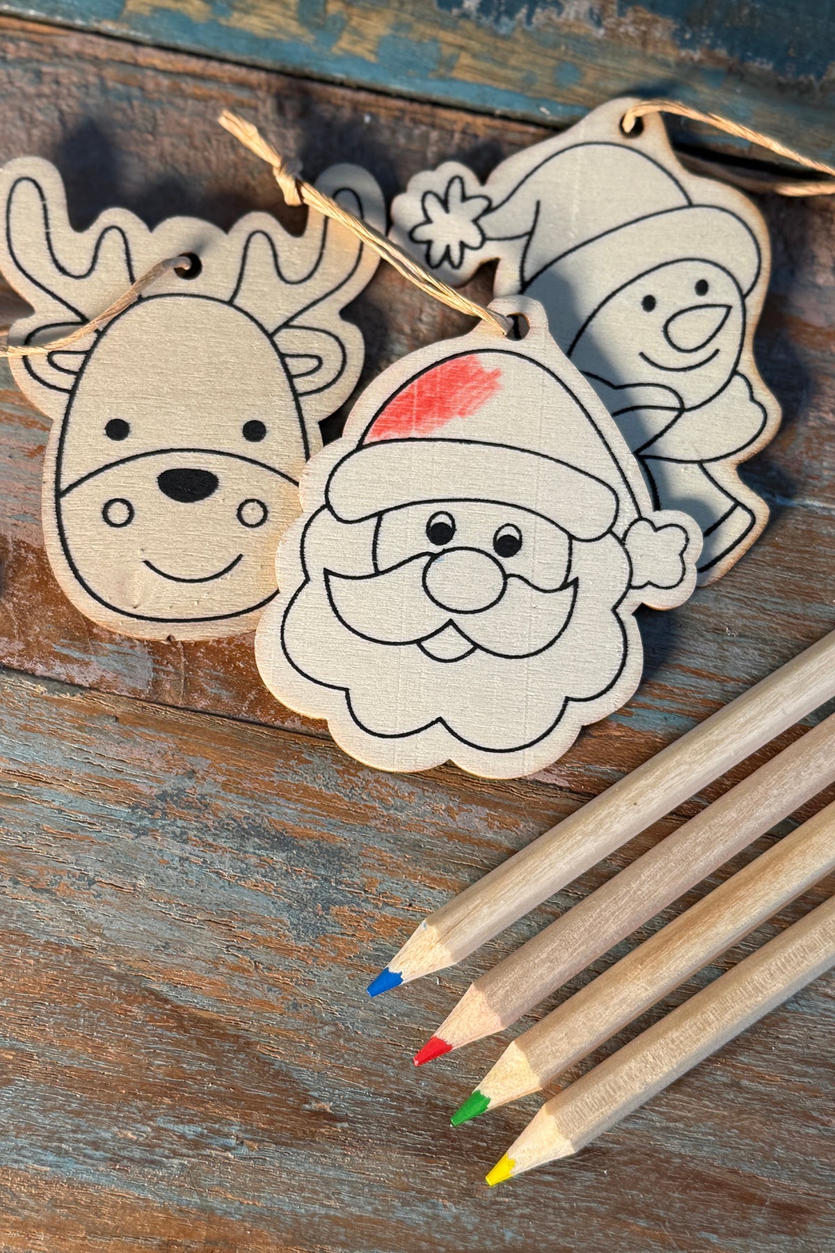 En lille kreativ kalendergave. 3 stk mal-selv juleophæng lavet i tyndt krydsfiner inkl. 4 små farveblyanter.