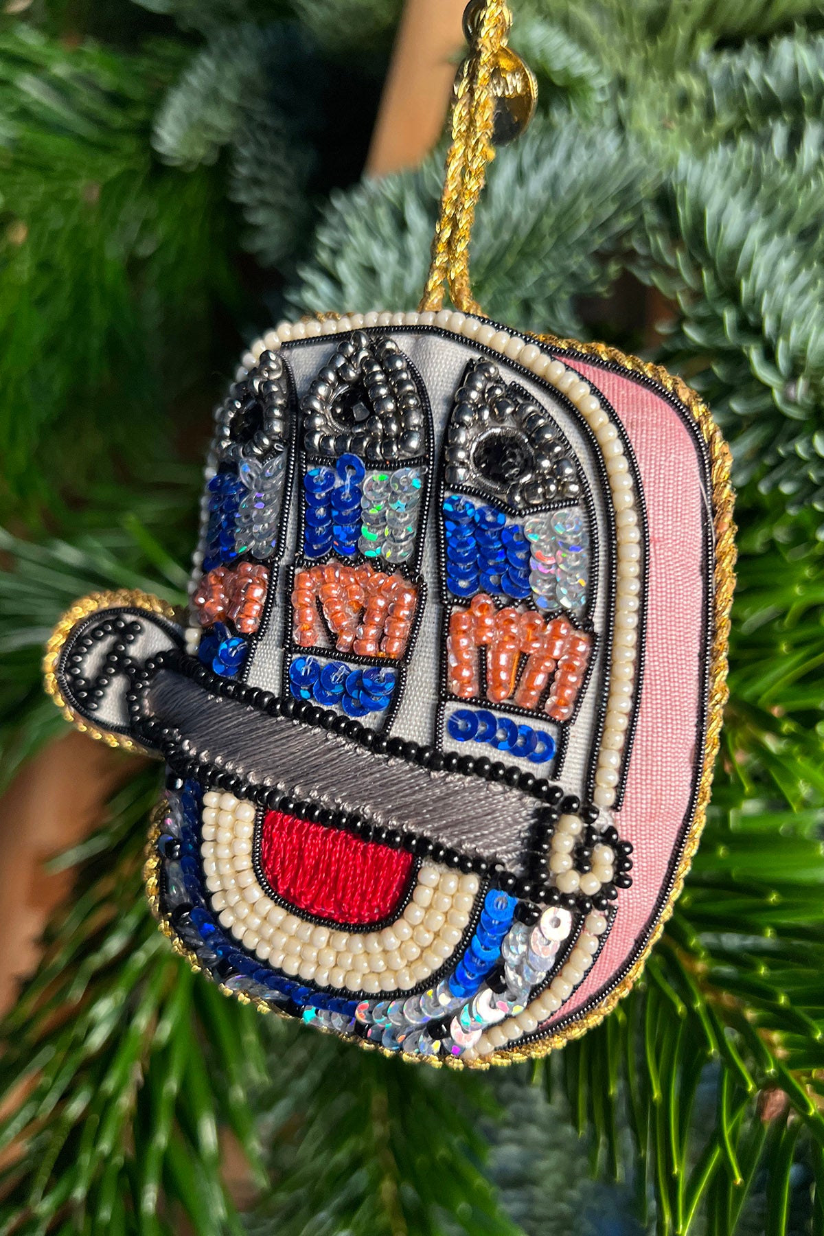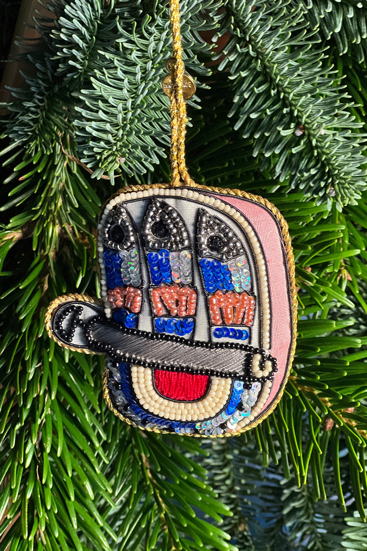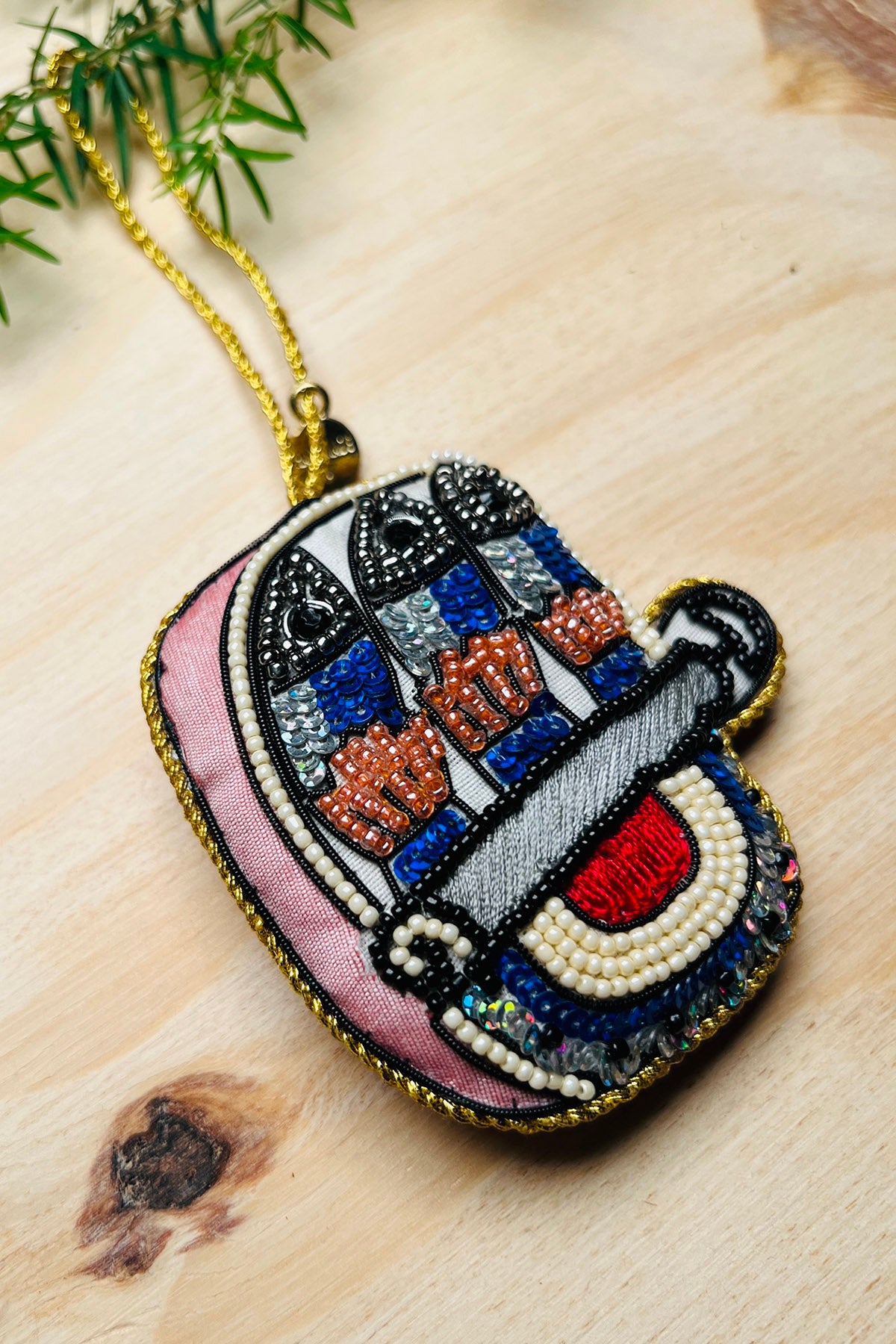 Lavet af håndfarvede glasperler med metallic-snor. Den er broderet ens på begge sider.