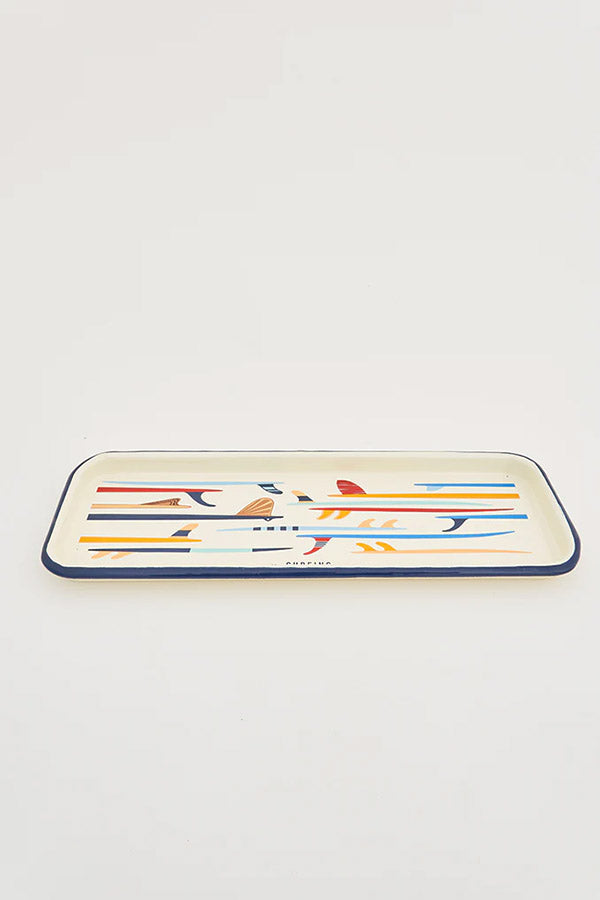 Emaljerede metalbakke med farverige surfboards. Perfekt til servering eller dekoration.