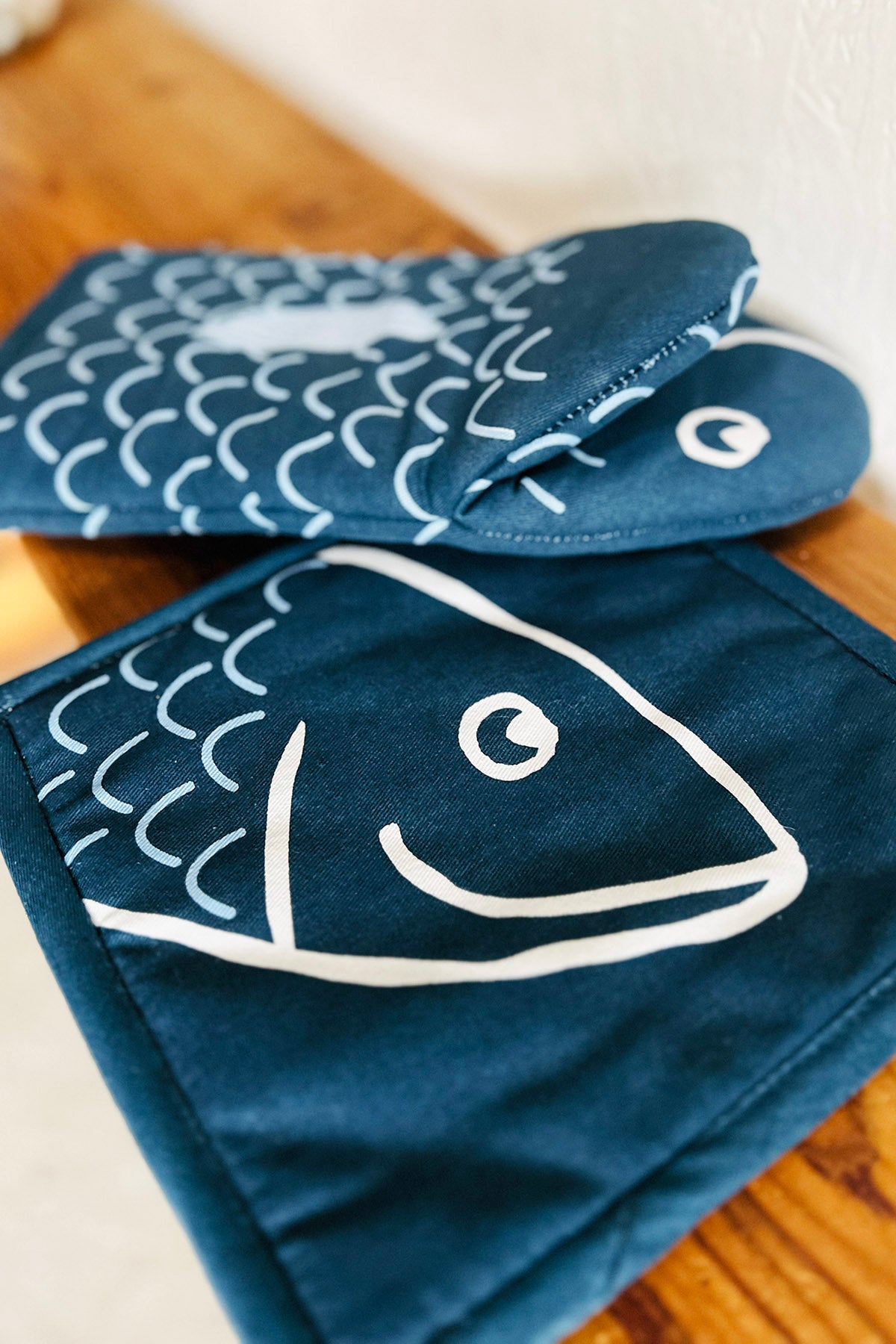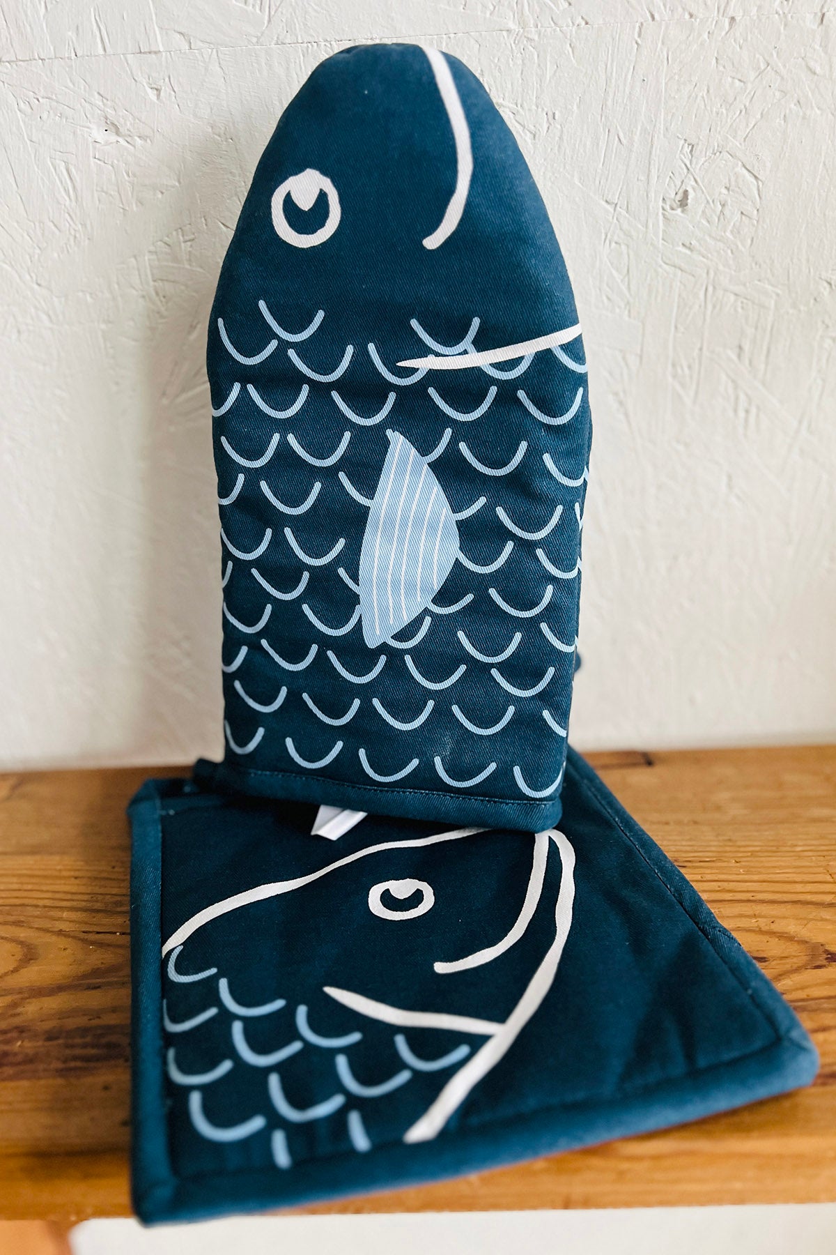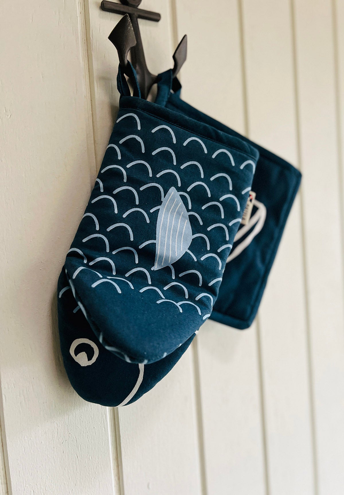 Et sæt med grydelappe og køkkenhandske.L: 14 cm - H: 25 cm L: 20 cm - H: 20 cm