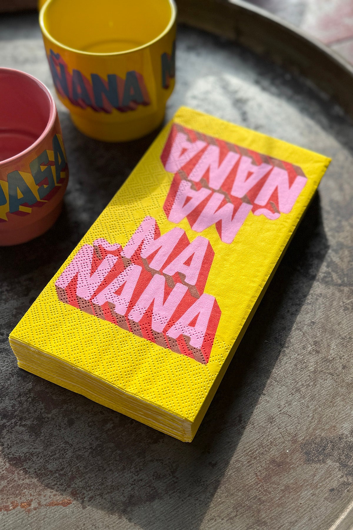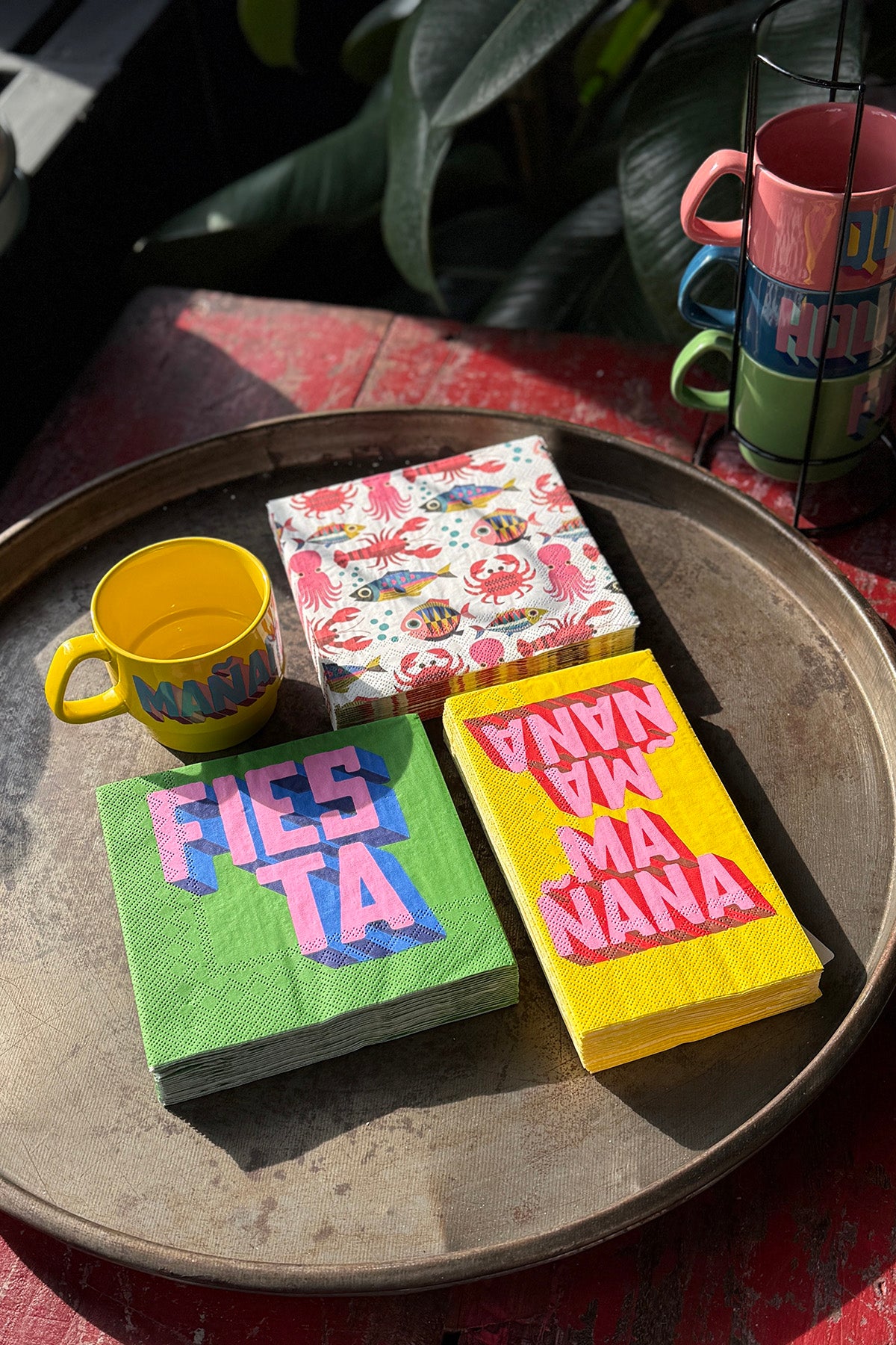 Farverige servietter.De er alle lavet af FSC-certificeret papir.Størrelser: Fiesta: 33 x 33 cmSealife: 33 x 33 cmMañana: 33 x 42 cm