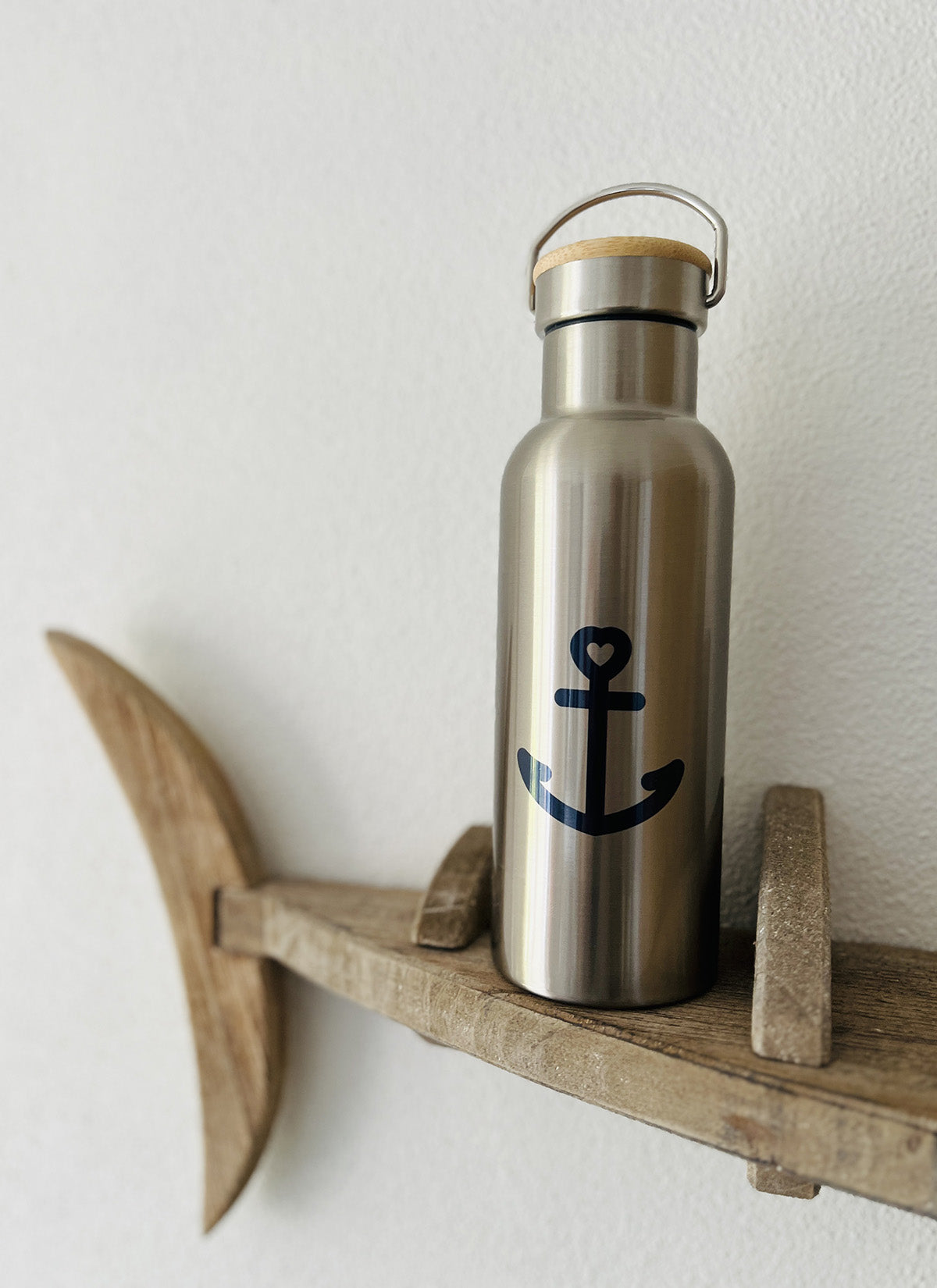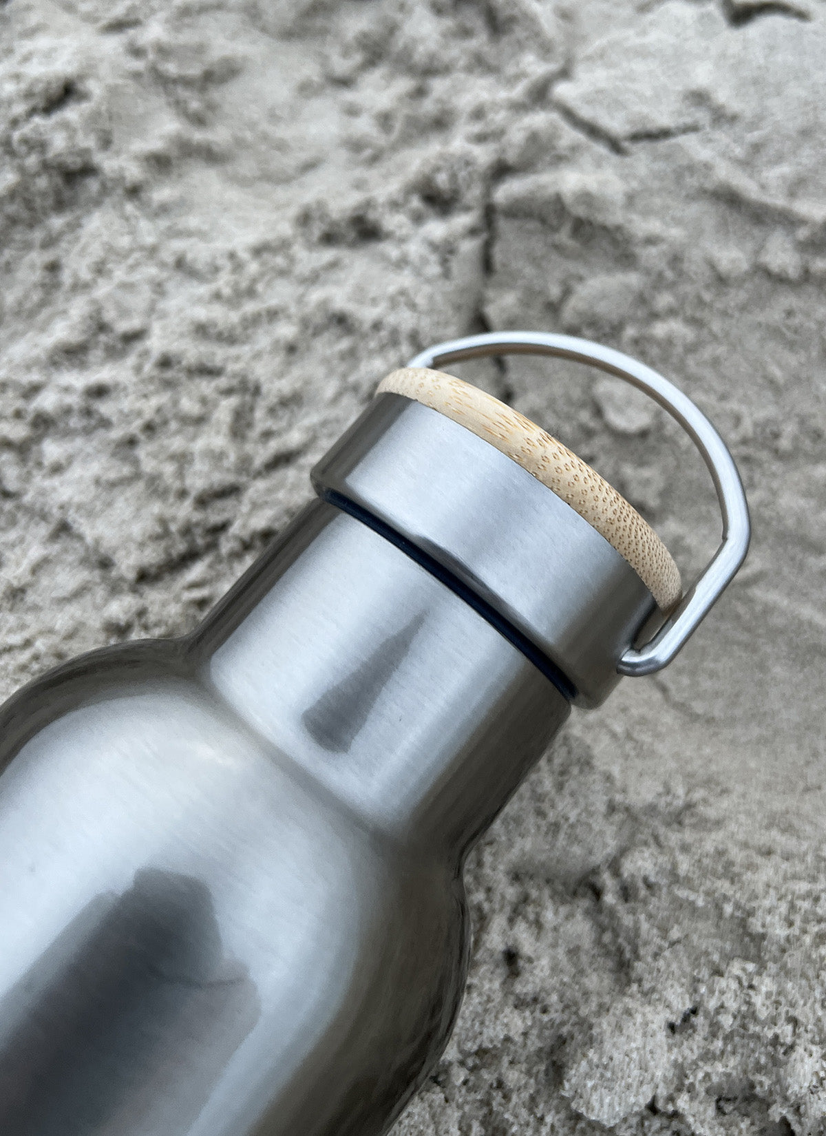 Thermo-drikkedunk i rustfri stål med bambuslåg og metalhank.