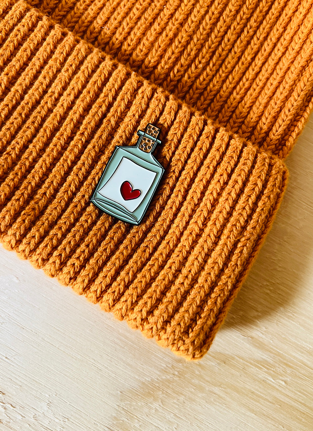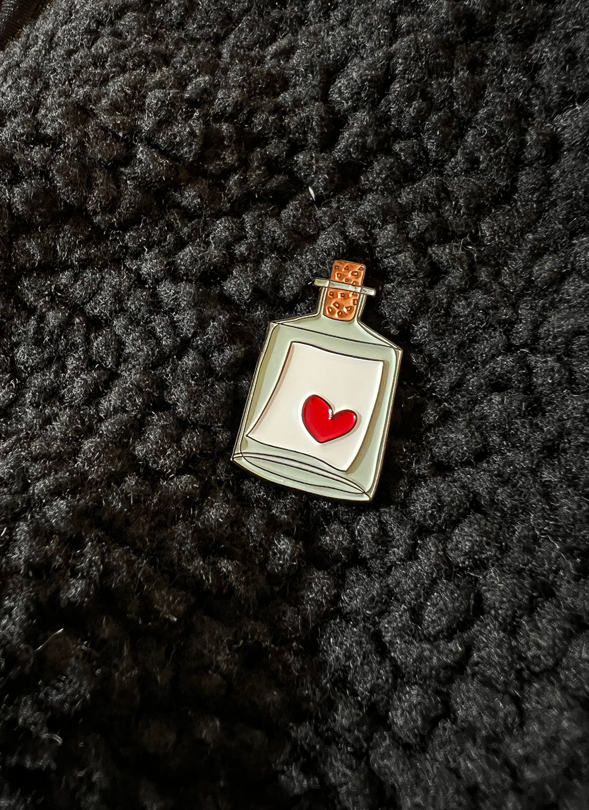 Emalje-pin med kærlighed på flaske leveres på en postkort.