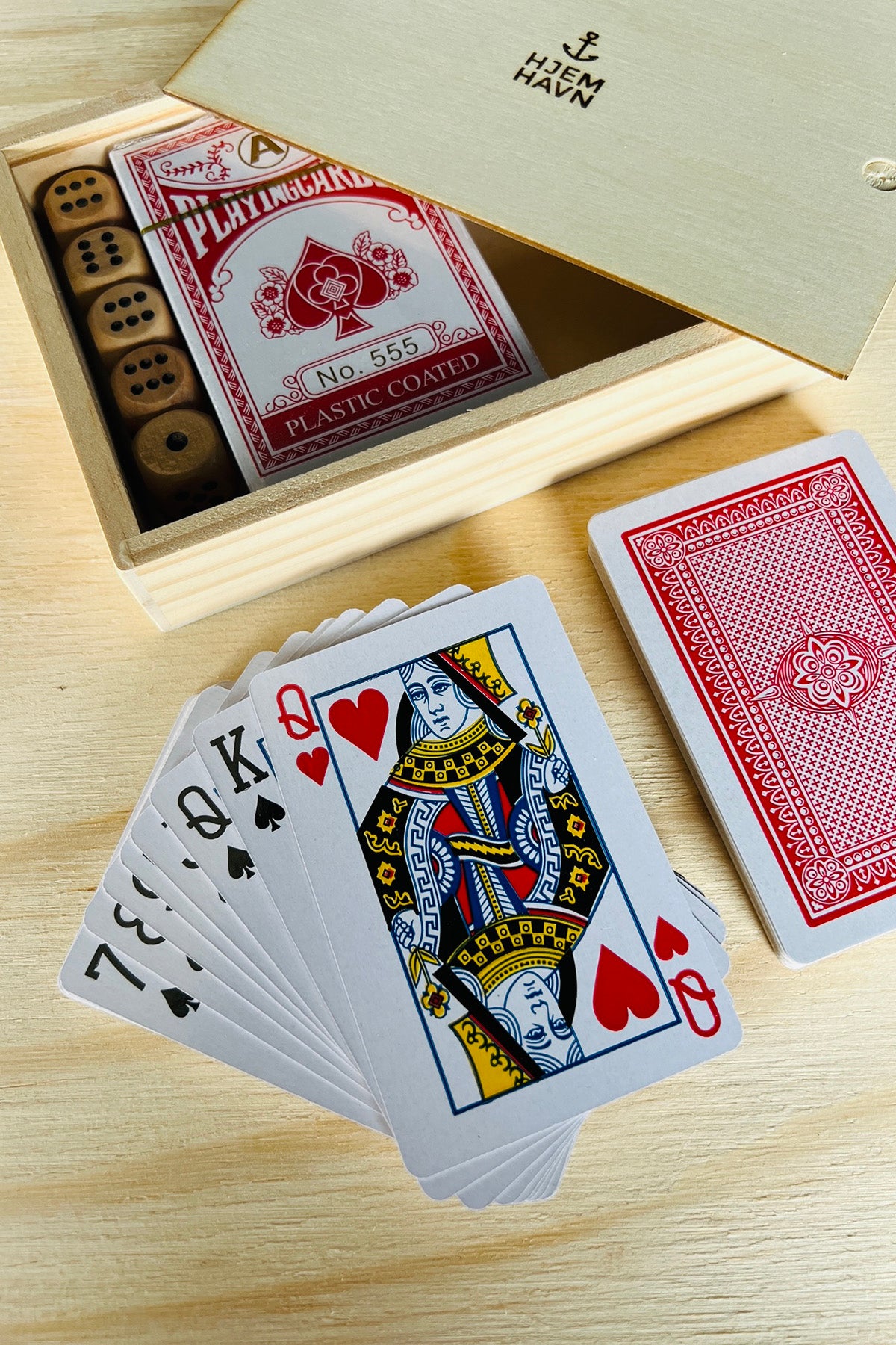 Spillekort i trækasse med terninger