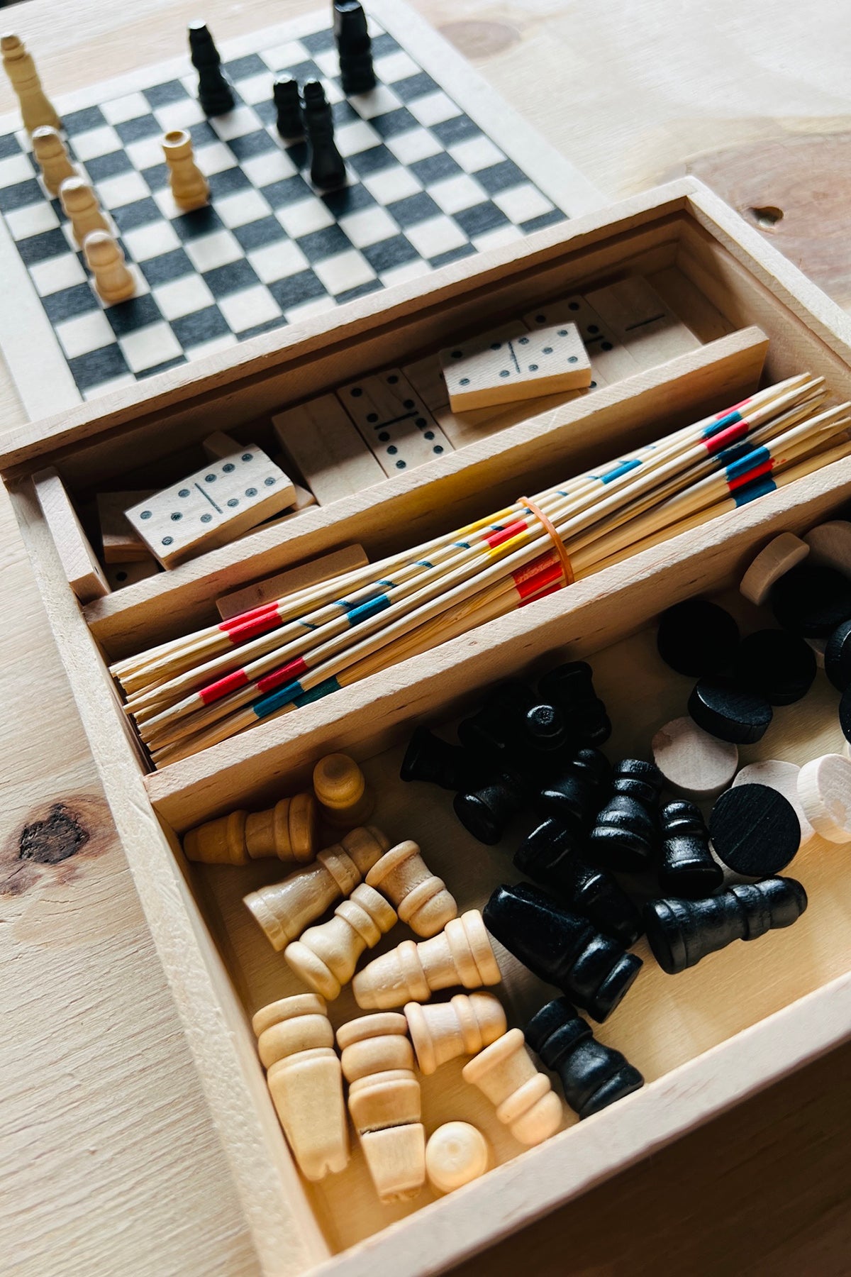 Trææske med skak, Mikado, dam og dominobrikker. Nok til en spilleaften med venner eller familie. Æske er kompakt (16,5 x 16,5 cm) og perfekt til sommerhuset eller på rejsen.