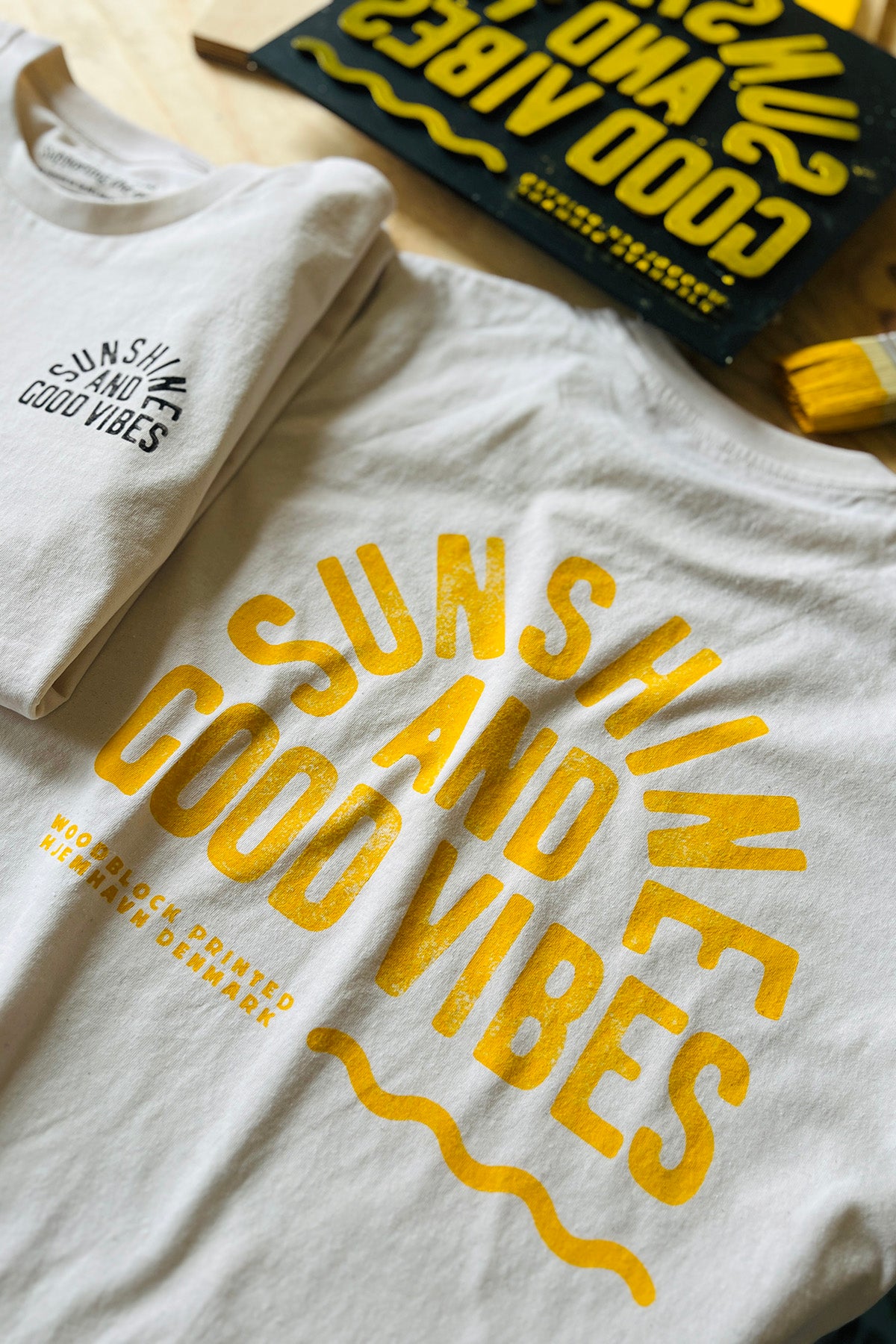 Vi håndtrykker efter ordre på old school manér med woodblock printing og serigrafi tryk. Dermed mindsker vi overproduktion og spild.