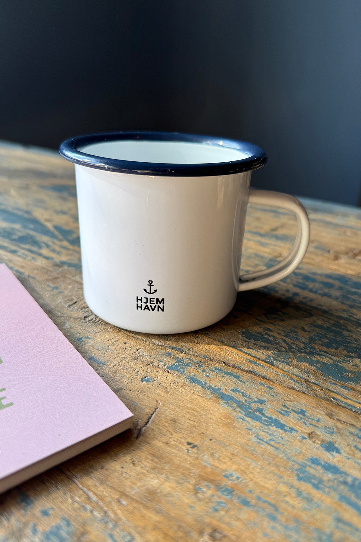 Klassisk hvidt emaljekrus med blå kant.